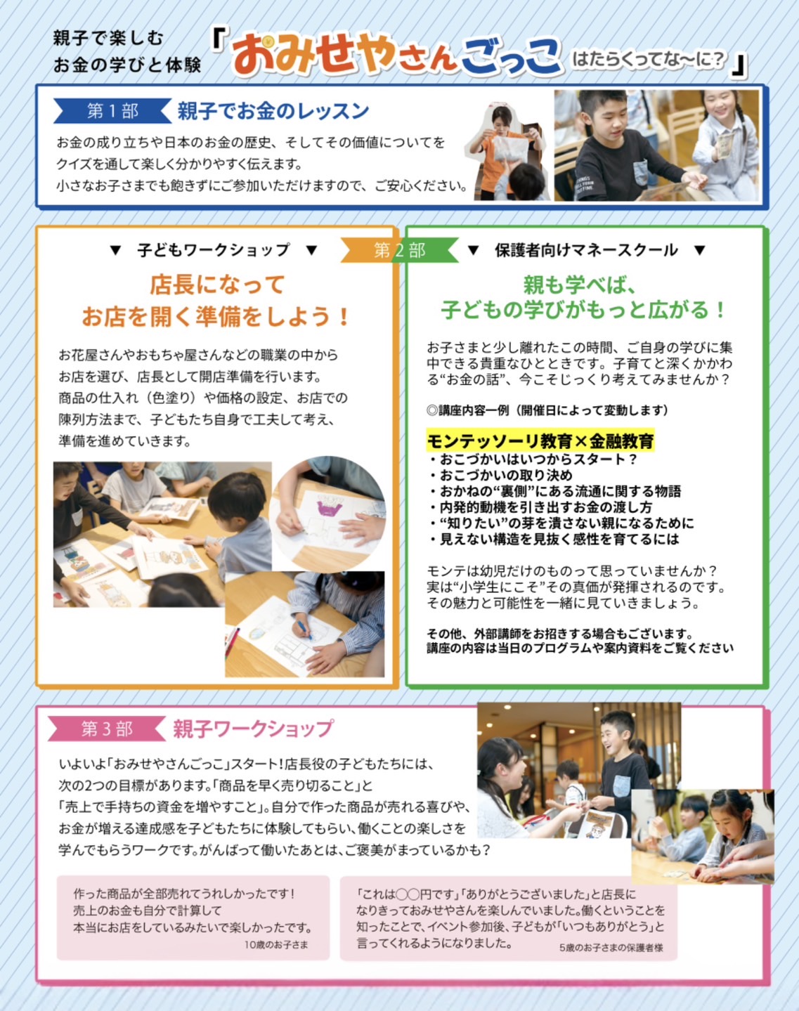 お金について学べるのは子どもだけではありません。親御さんにも短時間で効率よく学べる勉強会をご用意しています。